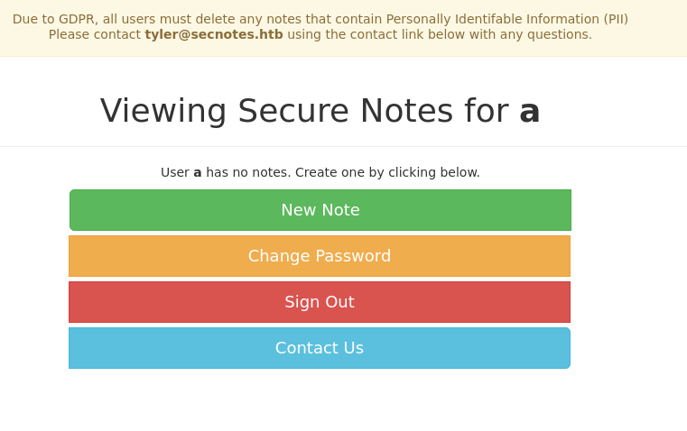 A note making website. Interesting. We can see that we got a possible user in the machine “tyler”. For me the new note section was quite interesting as it allowed us to make notes. Lets check it out